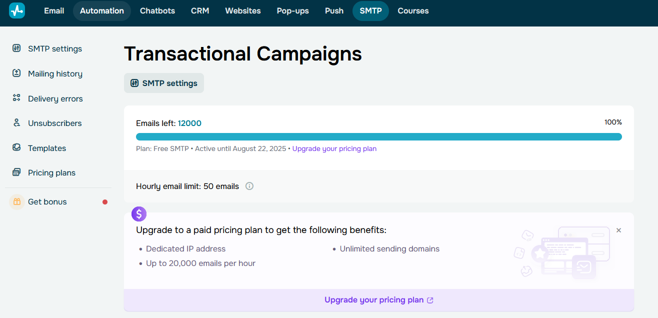 sendpulse也需要人工审核,我也收到了相关邮件,可以使用他们家的免费SMTP服务,这个免费额度是每个月12000条,确实很良心,且等SMTO2GO的额度用完了再用他家的吧。