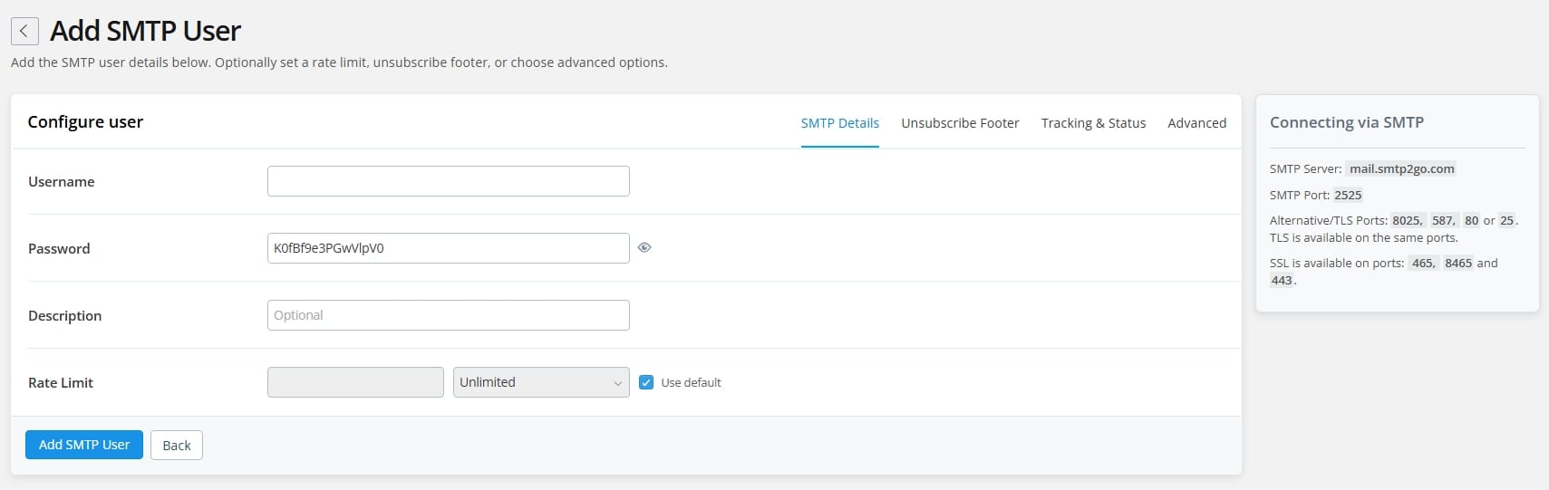 配置SMTP:在左侧边栏sender区域找到SMTP User,然后添加SMTP User,首次配置系统都会有详细的提示,配置完成后,就会弹出相关的服务配置信息,然后需要在Ghost的托管后台填入。