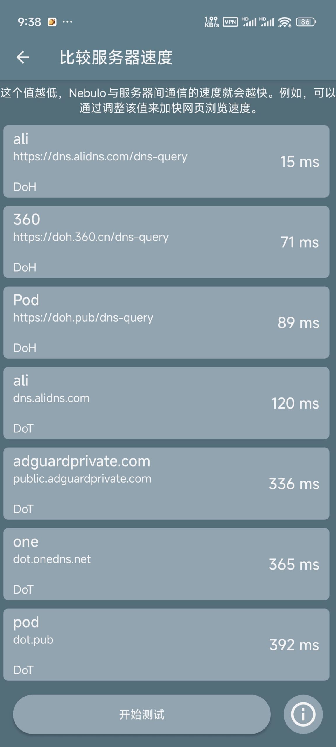 测试服务器连接速度:可以一键测试所有DNS服务器的连接速度,非常方便。点击右下角的类似🛜的图标,然后就可以进入“比较服务器速度”模块,这里可以一键测速,可以总体上得到一个相对的速度,选择一个更快的服务器才能体现这个APP的最大价值。