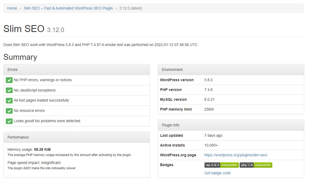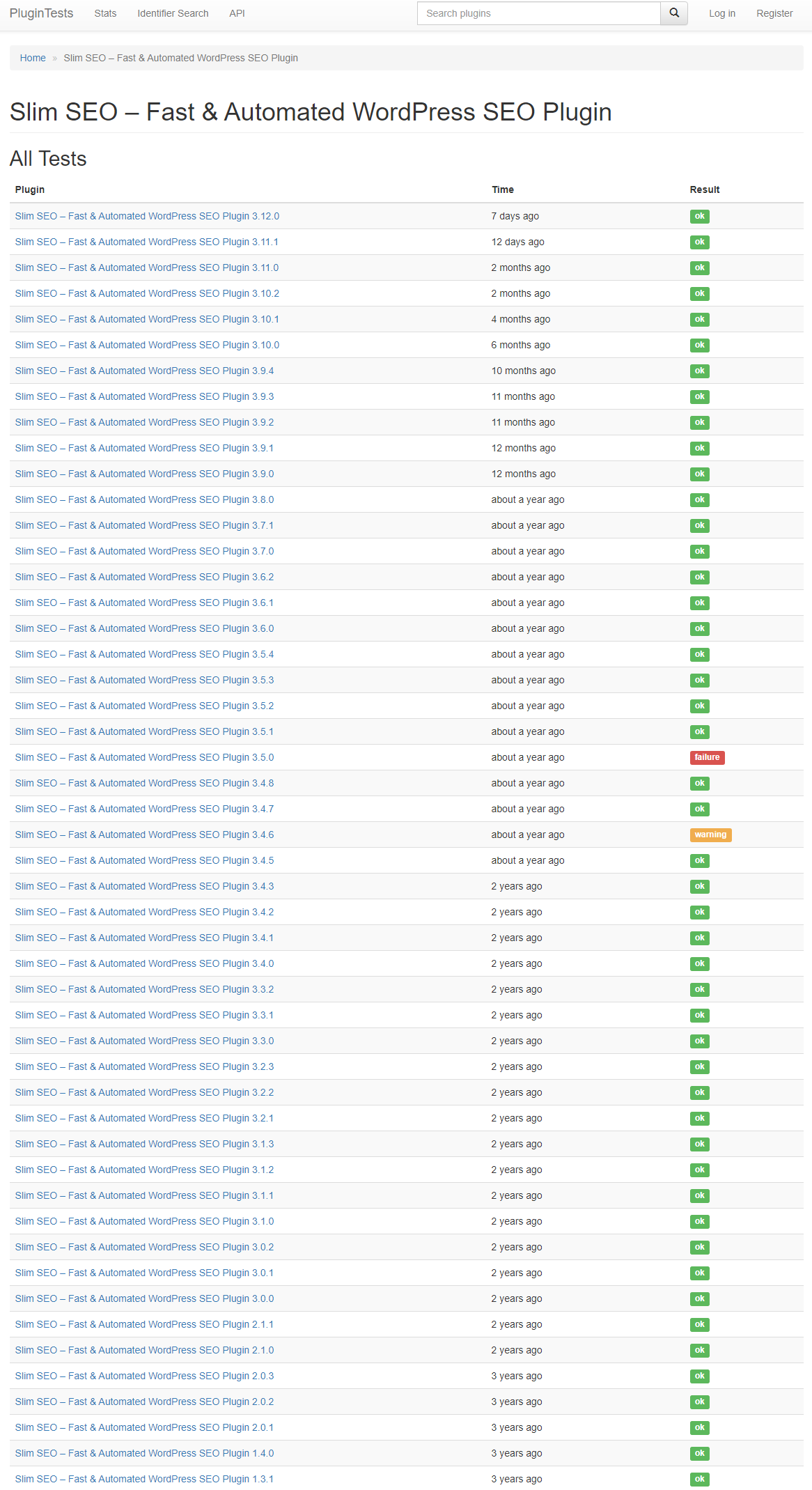 例如,我搜索一款插件,Slim SEO,可以看到多个历史版本的测试数据,并对某各版本进行了评价。