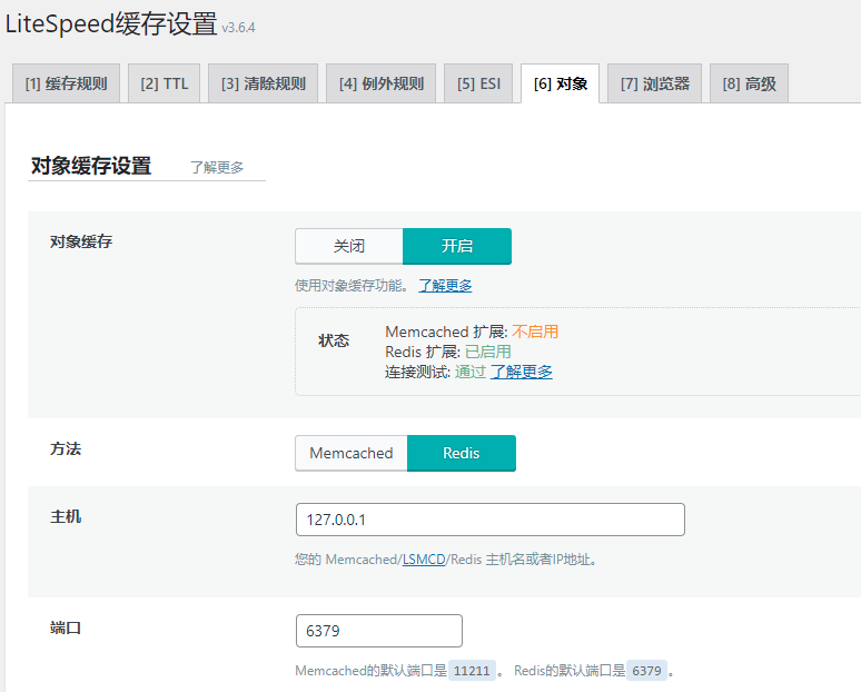 重启LiteSpeed服务,WordPress后台找到LiteSpeed插件,打开缓存规则,打开第6个选项卡对象,然后开启对象缓存。注意选择好对应的方法:Redis,对应的端口6379,如何是阿里云还需要在安全组设置相应的端口。状态为绿色就表示已经正确使用Redis缓存了。