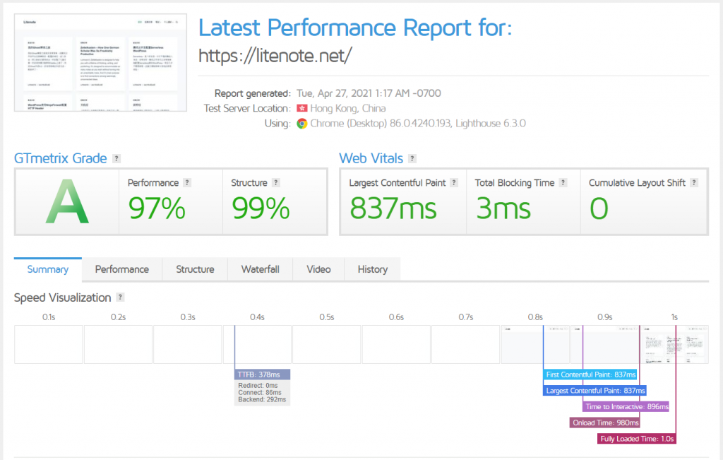 我也在Gtmetrix上对我的网站进行了测试,得到A,Performance 97%,Structure 99%的成绩。