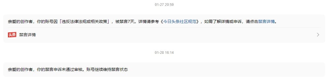 这个事情是真的让我非常难受的,因为,说真的,对于一个头条关注者仅200多的账号,我能干什么,我自认为分享的东西是能带给读者一些好处的。但是,还是有几篇文章因为“违反法律法规或相关政策”,导致被禁言7天。