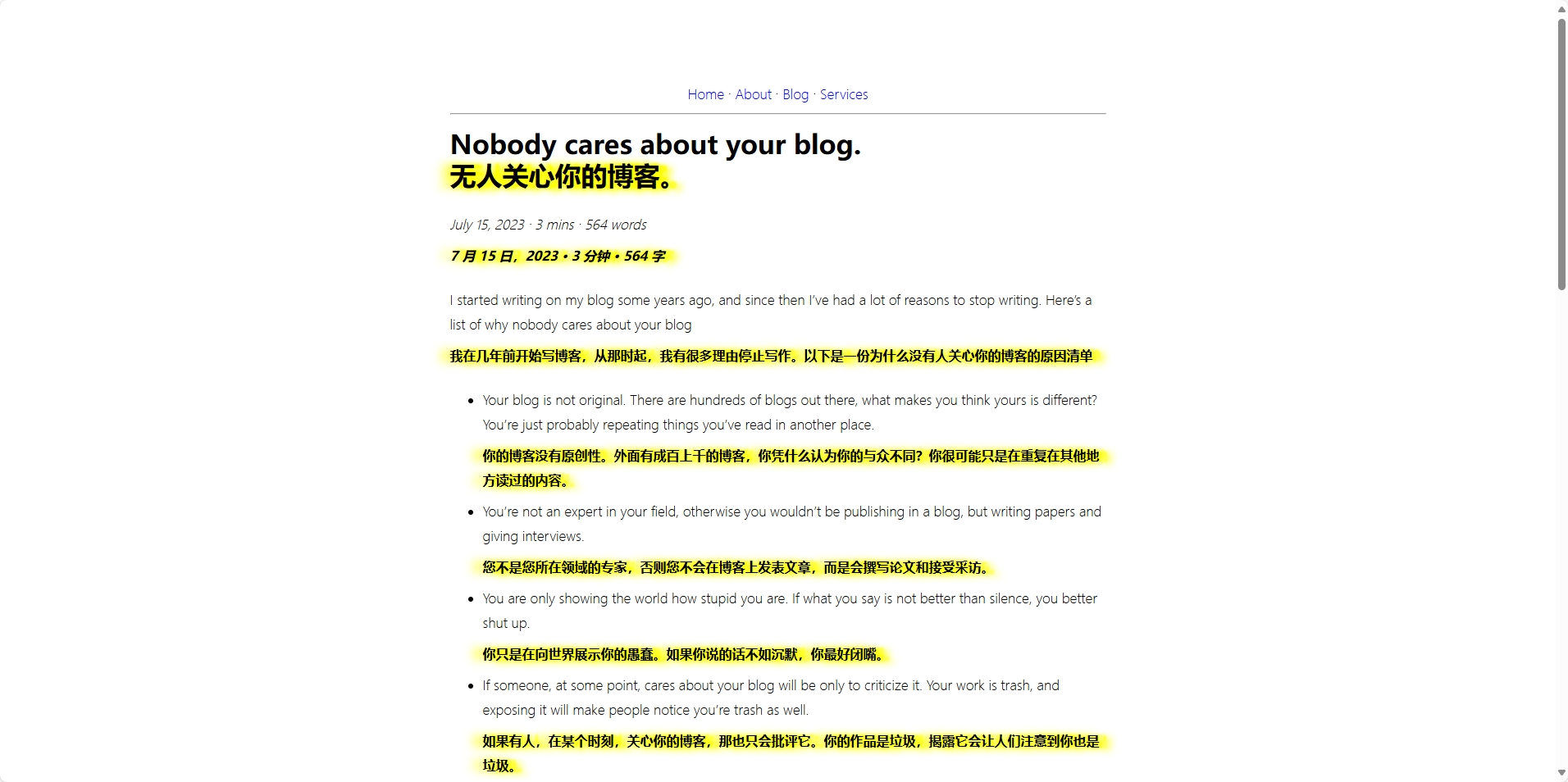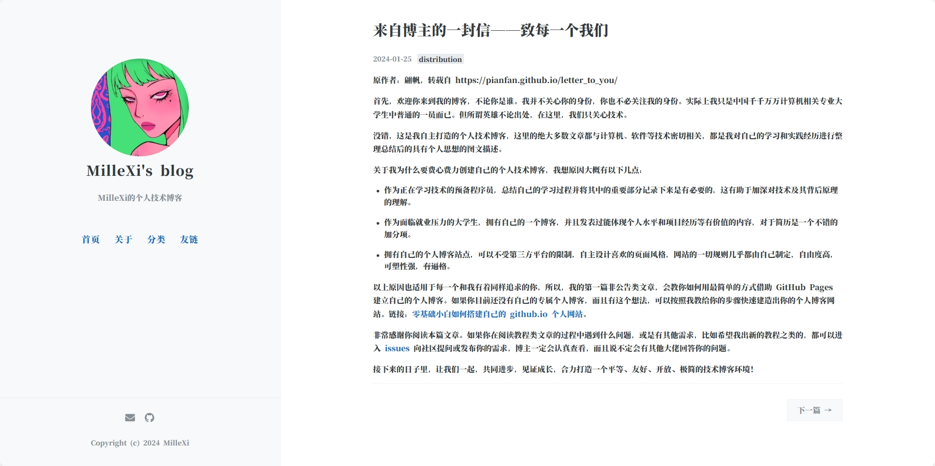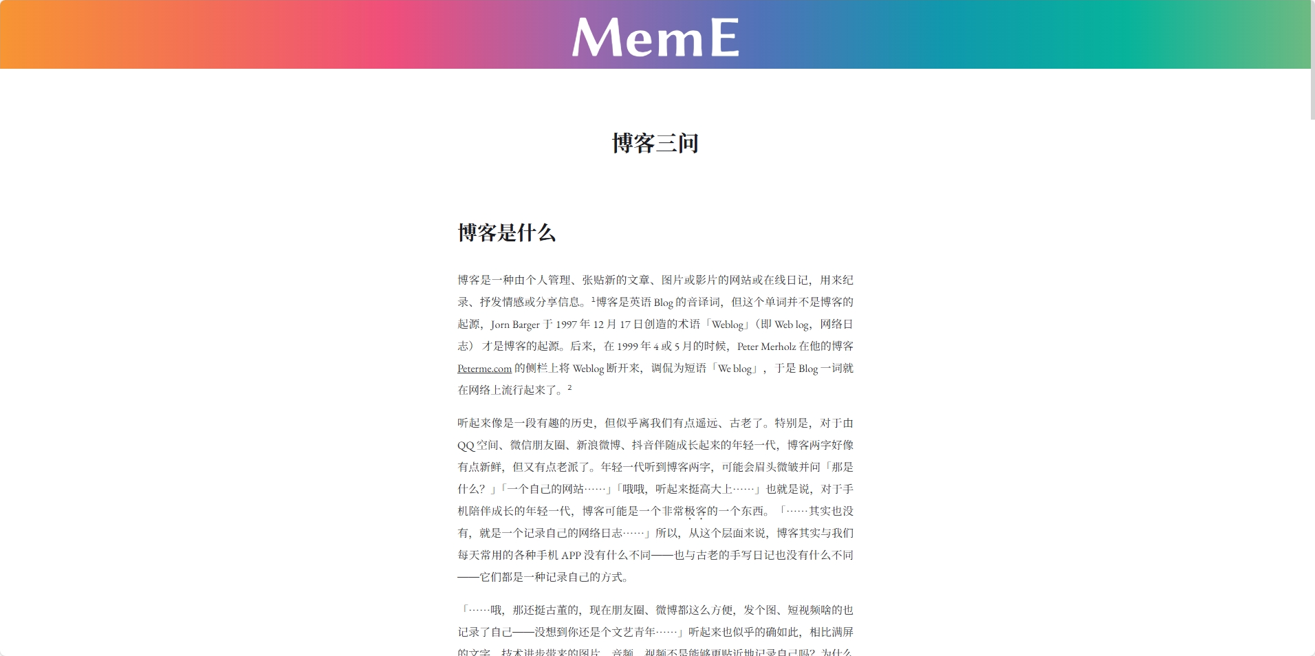其实关于建站的文章一大把,核心的观点其实都大差不差,也只有自己亲身经历过的人,读起这些文章,才会真的产生情感共鸣。我觉得,博客对我来说,一是一个思想、过程、好东西的记录何分享,其主要产生的价值对我来说就是情绪价值,我发布一篇文章,我把我的网站整成自己喜欢的样子,我觉得就足够了。