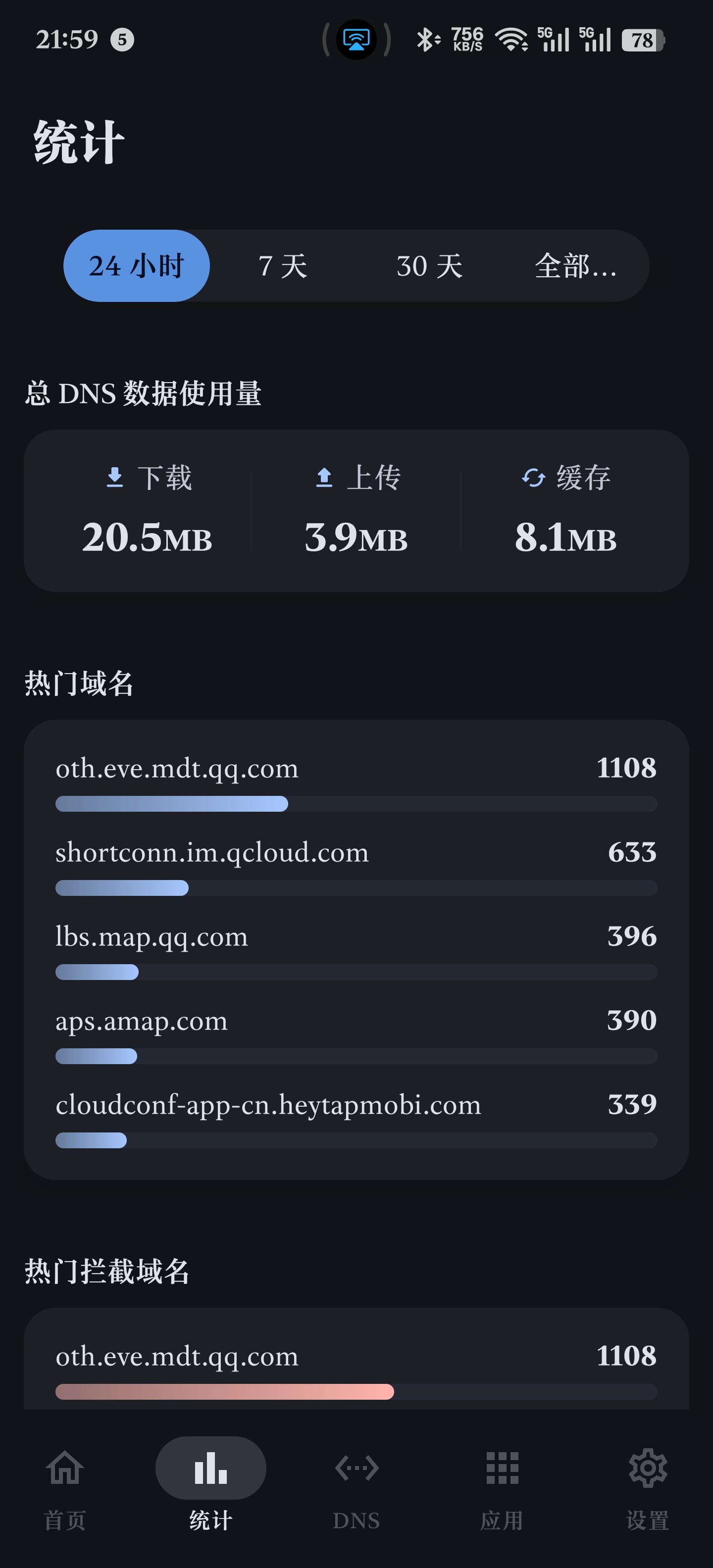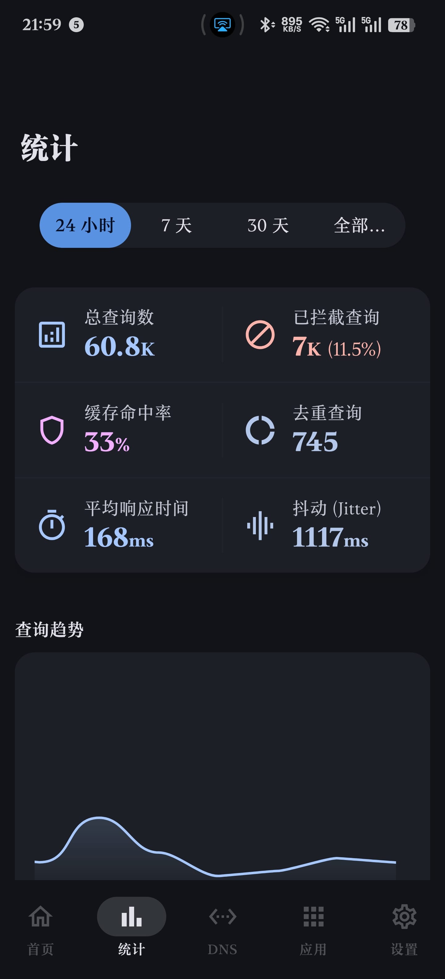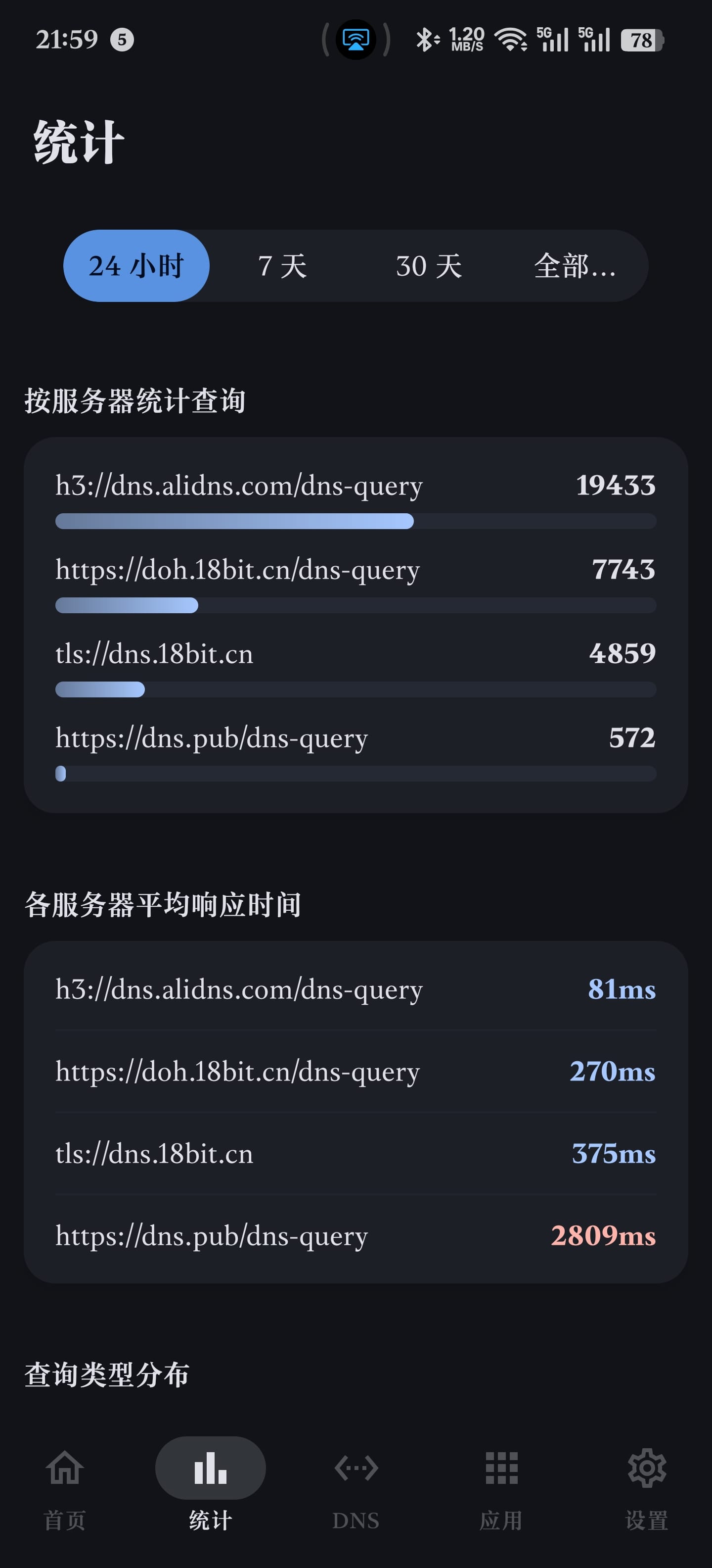 提供了全面的统计功能,包括查询总数、拦截情况、缓存命中率、响应时间等基础统计信息,也有图形化的查询量和拦截量,总的数据使用量,以及查询最多的域名、拦截最多的域名、各服务器的使用情况和响应时间等等。