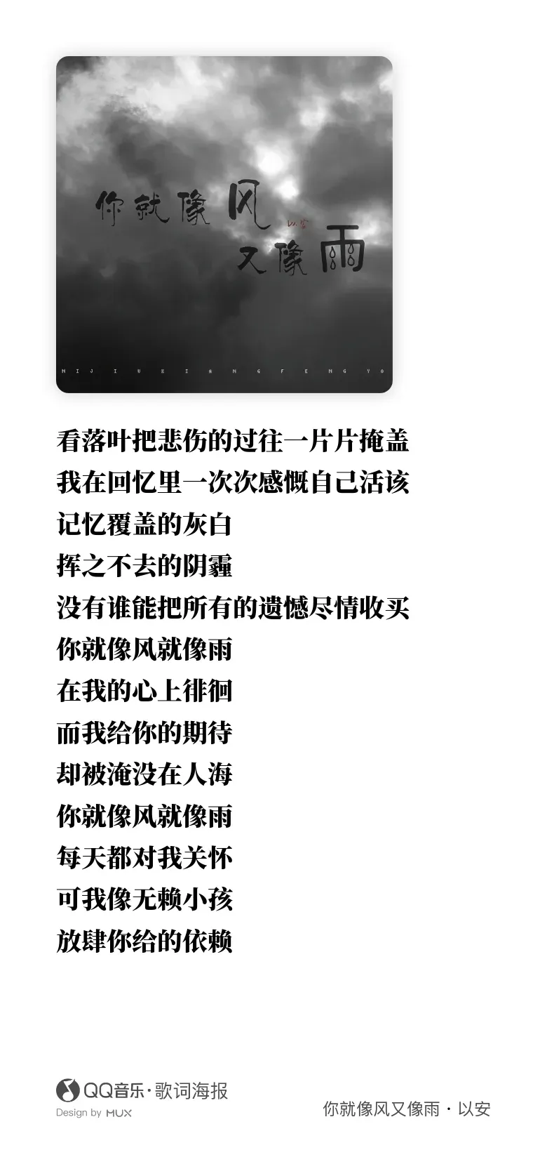 看落叶把悲伤的过往一片片掩盖,我在回忆里一次次感慨,自己活该。记忆覆盖着灰白,挥之不去的阴霾,没有谁能把所有的遗憾。你就像风又像雨,在我的心上徘徊,而我给你的期待呀,却被淹没在人海。你就像风又像雨,每天都对我关怀。可我想我来是海『像无奈小孩』,放肆你给的依赖。