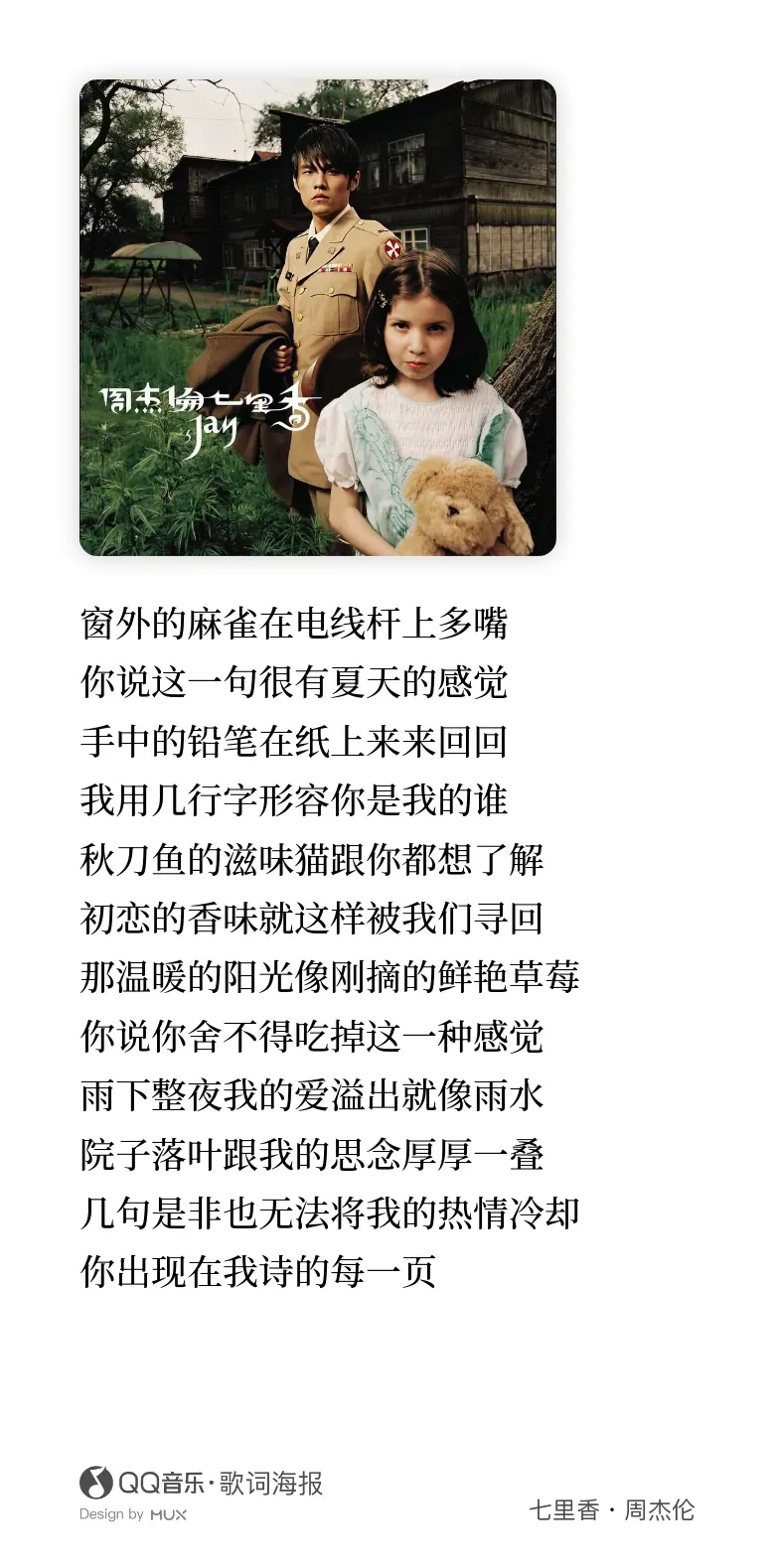 窗外的麻雀,在电线杆上多嘴,你说这一句,很有夏天的感觉,手中的铅笔,在纸上来来回回,我用几样字形容你是我的谁。秋刀鱼的滋味,猫跟你都想了解,初恋的香味就这样被我们寻回,那温暖的阳光像刚摘的鲜艳草莓。说你舍不得吃掉这一种感觉雨下整夜,我的爱溢出就像雨水院子落叶跟我的思念厚厚一叠几句是非,也无法将我的热情冷却。你出现在我诗的每一页。