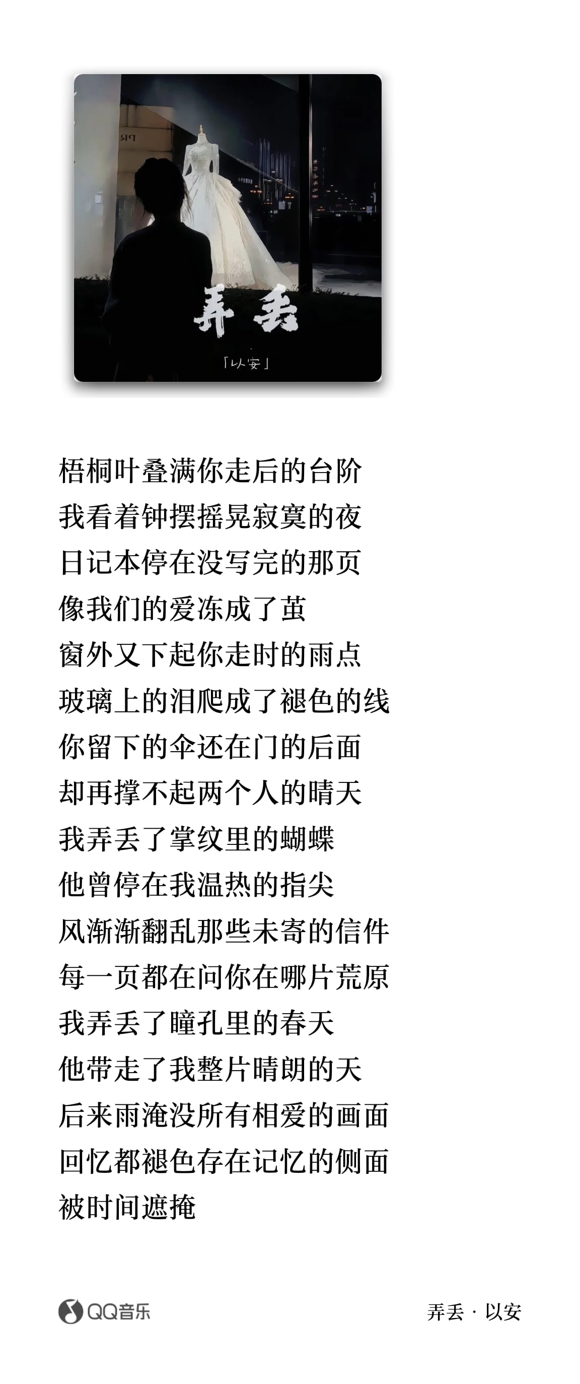 梧桐叶点满你走后的台阶。我看着钟摆摇晃,寂寞的夜,日记本停在没写完的那页。像我们的爱冻成了尖『茧』,窗外又下起你走时雨。雨点『走时的雨点』玻璃上的泪爬成了褪色的线。你留的伞还在门的后面,却再撑不起两个人的晴天。今天。不能『我』丢了掌纹里的蝴蝶,它曾停在我温热的指尖。风渐渐纷乱『翻乱』,那些未去的心结『未寄的信件』,每一页都在问你在哪片荒野『原』。不能『我弄』丢了瞳孔里的春天,它带走了我整片晴朗的天。后来雨淹没所有相爱的画面,回忆都褪色,存在记忆的侧面,被时间遮掩。