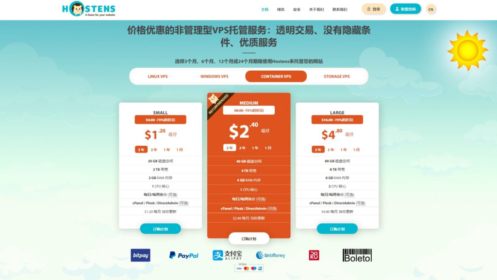 这款VPS是在知乎上发现的,去官网看了一下,价格确实便宜,重要的是,这家是从2004年就开始做了。于是看了一下不同产品的配置、价格,感觉非常厚道,介于我在甲骨文云上面的免费VPS配置过低、速度过慢,于是我就试试 吧,先整一个最便宜的Container VPS 3年合约价为1.2美元/月,性价比还不错。