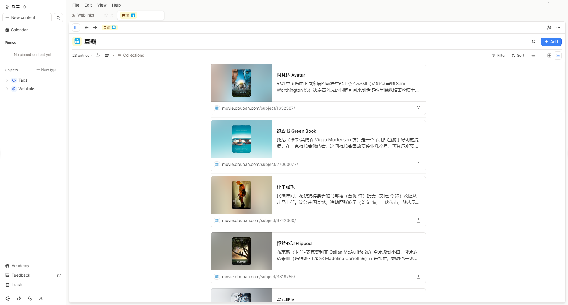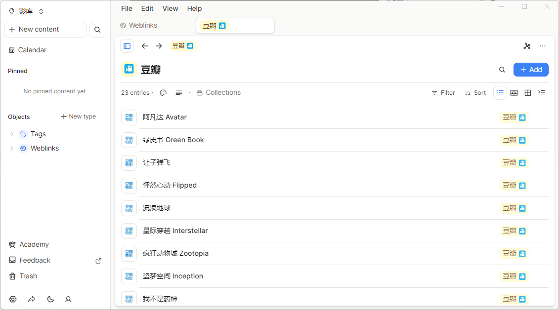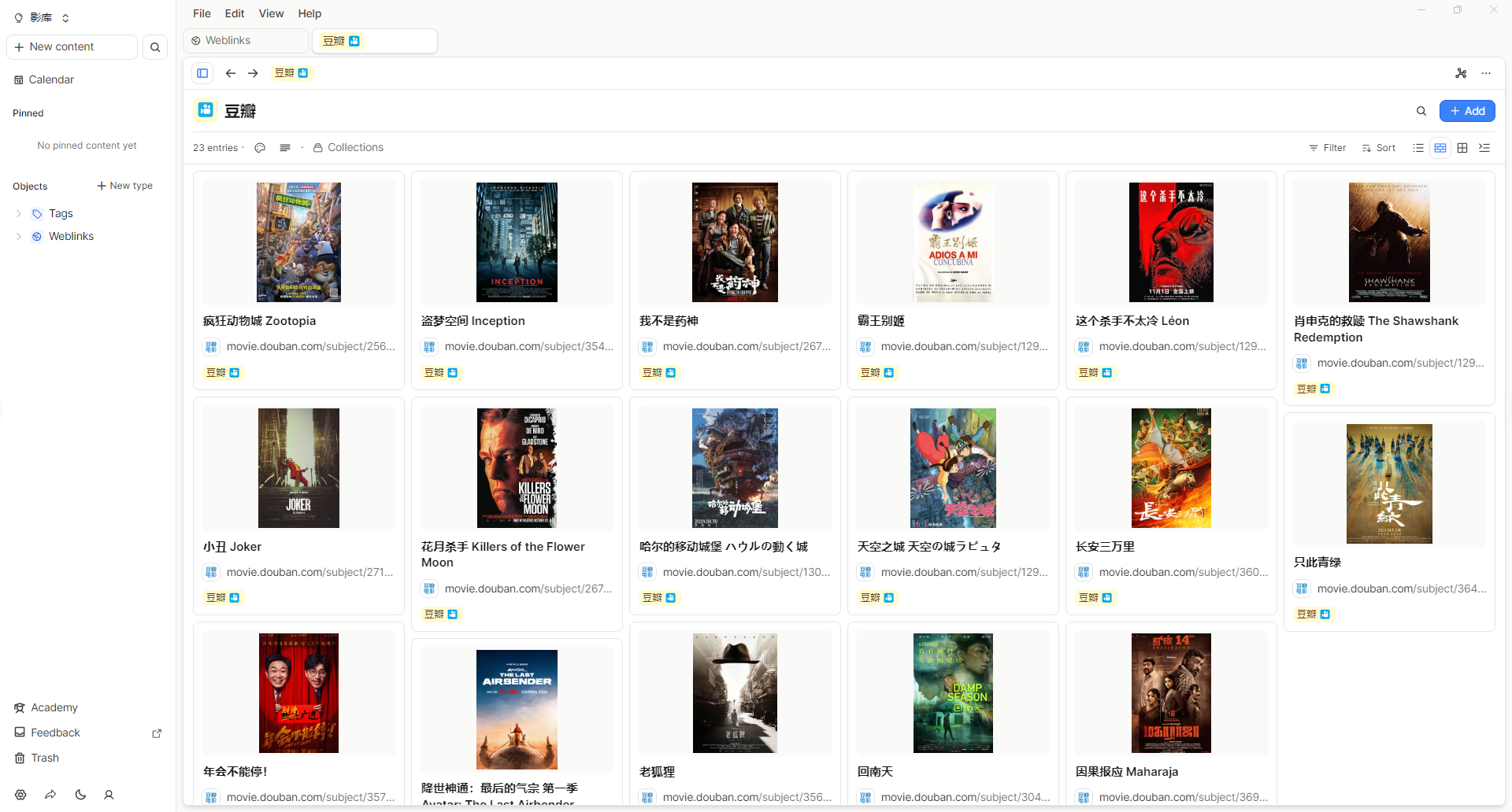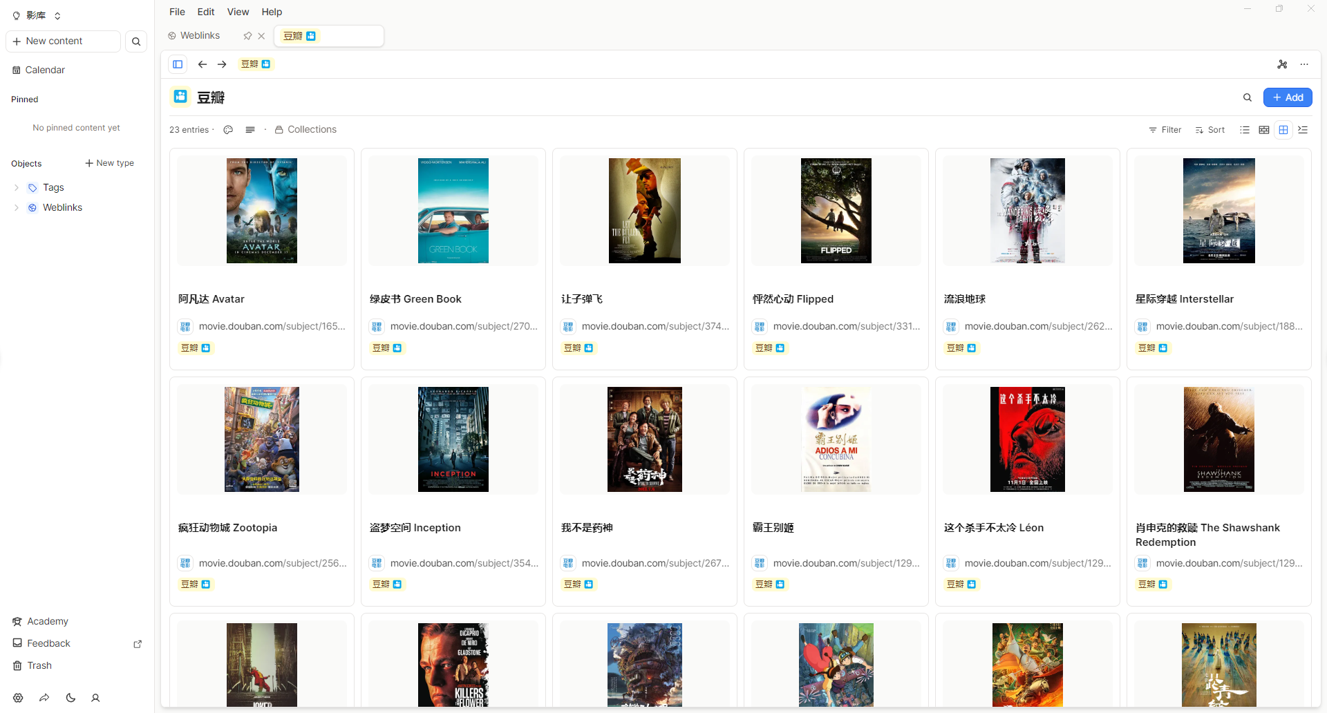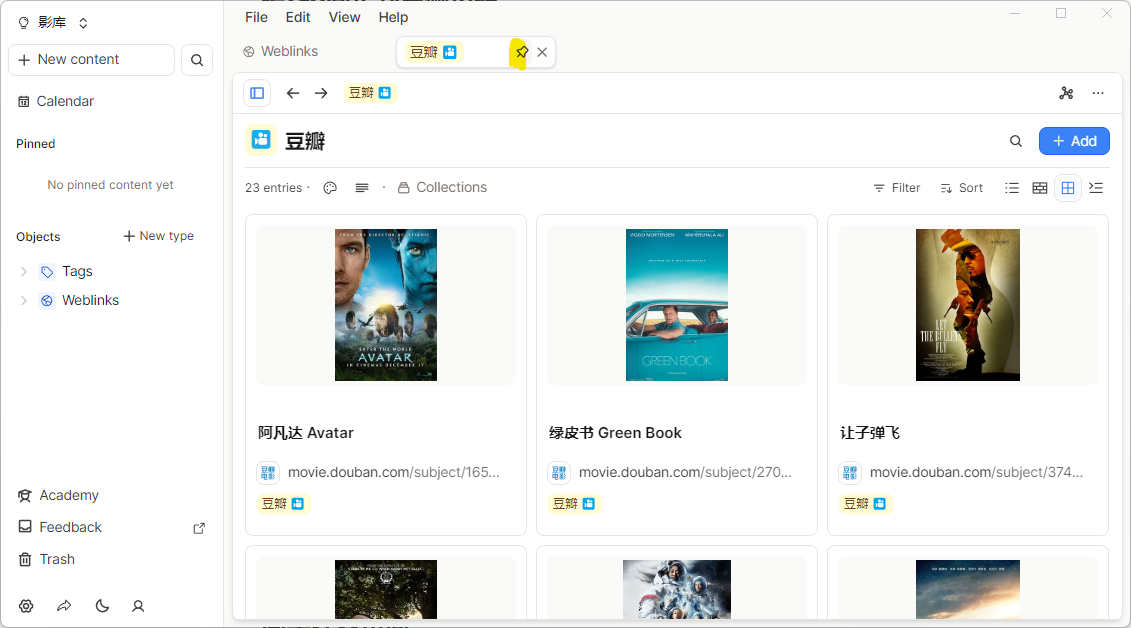 当你添加了一部分影视资料后,就可以Capacities的tag页面找到豆瓣、或者在Weblink类型里面查看你的影库。在Capacities里面,我们刚才添加的内容属于系统基础层面的Weblink(网页链接),有4种查看方式:列表、Wall(展示墙)、Gallary(画廊)、Embed(嵌入),看你自己的喜好。