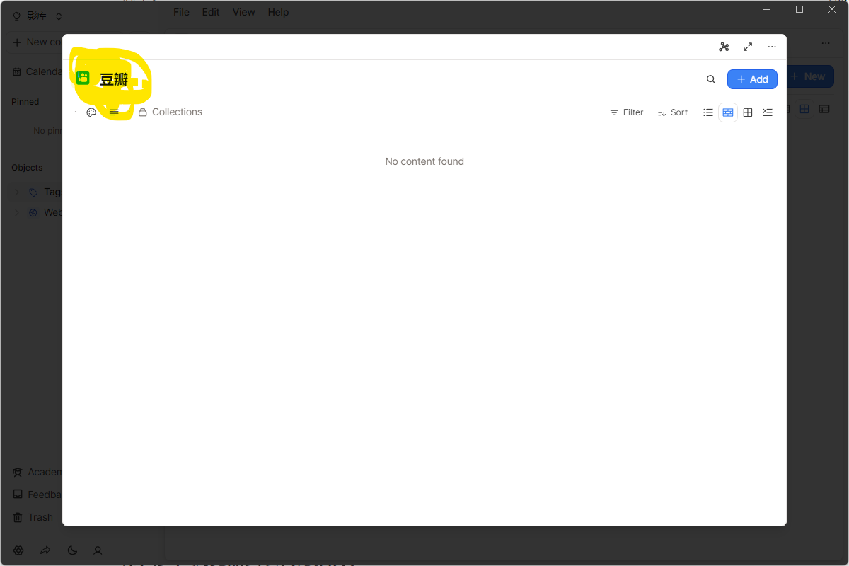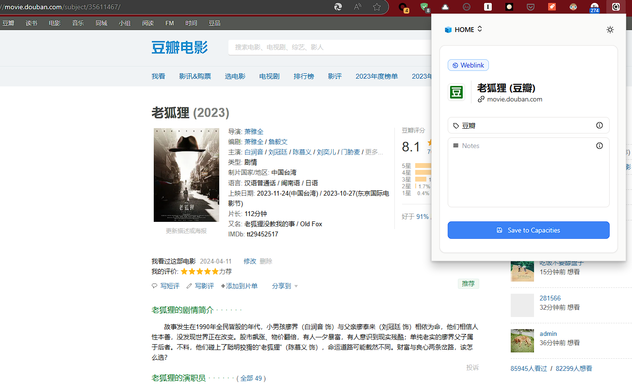 打开豆瓣电影页面,搜索你喜欢的、想要进入观影库的电影,并打开详情页面,然后点击Capacities Web Extension,将页面保存下来。记住,在保存的可以先添加tag,把“豆瓣”这个标签先输入进去,然后Capacities就可以直接帮你分类整理,并且下载电影封面、基本内容介绍、网页链接等内容了。