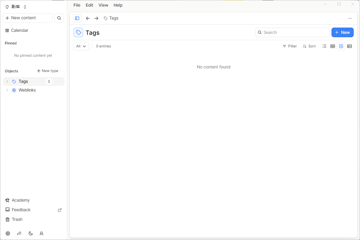 点击左侧边栏的Tags,然后右上角蓝色底的按钮“+New”,新建一个标签,修改名称即可,然后点击其他区域(黑色阴影区域)返回主界面。