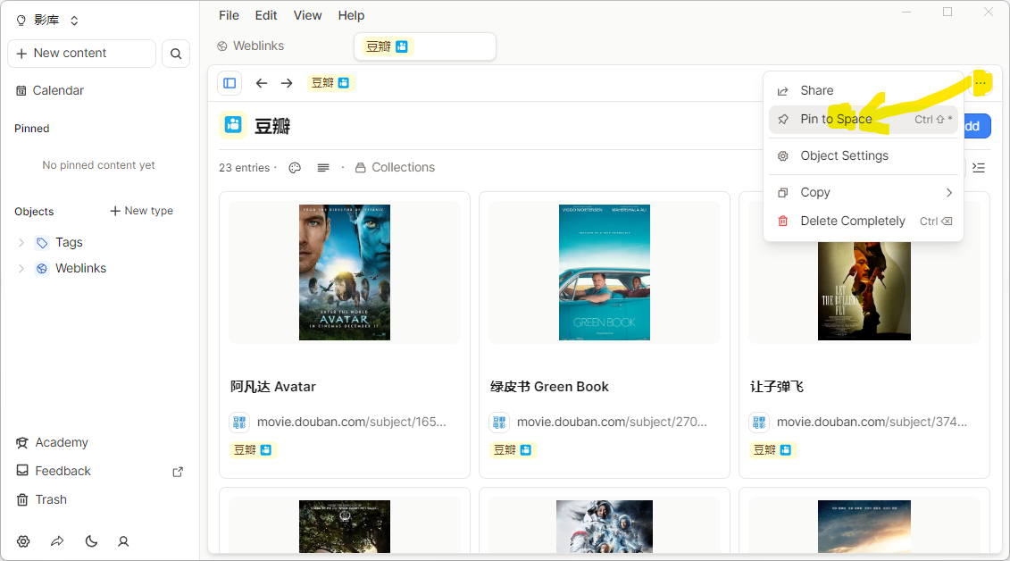 个人建议直接把“豆瓣”这个tag固定到左侧边栏,方便以后查看,这就是一个可以非常方便快捷地创建观影库的方案。在“豆瓣”tag页面,右侧点击选项按钮,选择Pin to Space即可。