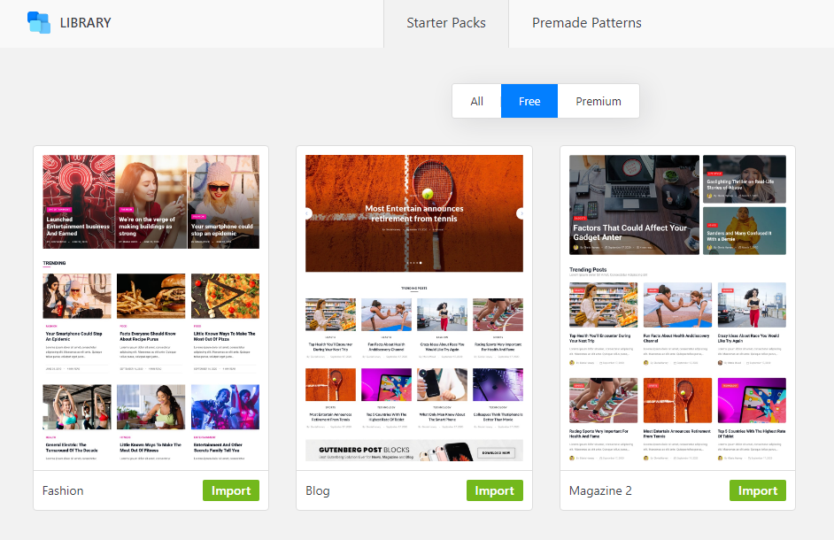 目前PoxtX还不能很好兼容全站编辑主题,不过可以通过新建页面,来跟更成熟的传统主题配合使用,整体效果更好。点击右上角的PostX Library,就会弹出一个对话框,筛选Free,就可以看到3个免费的模板。由于这是块编辑器,虽然3个免费的模板是官方定制好的,你也可以单独使用个别元素进行随意组合。