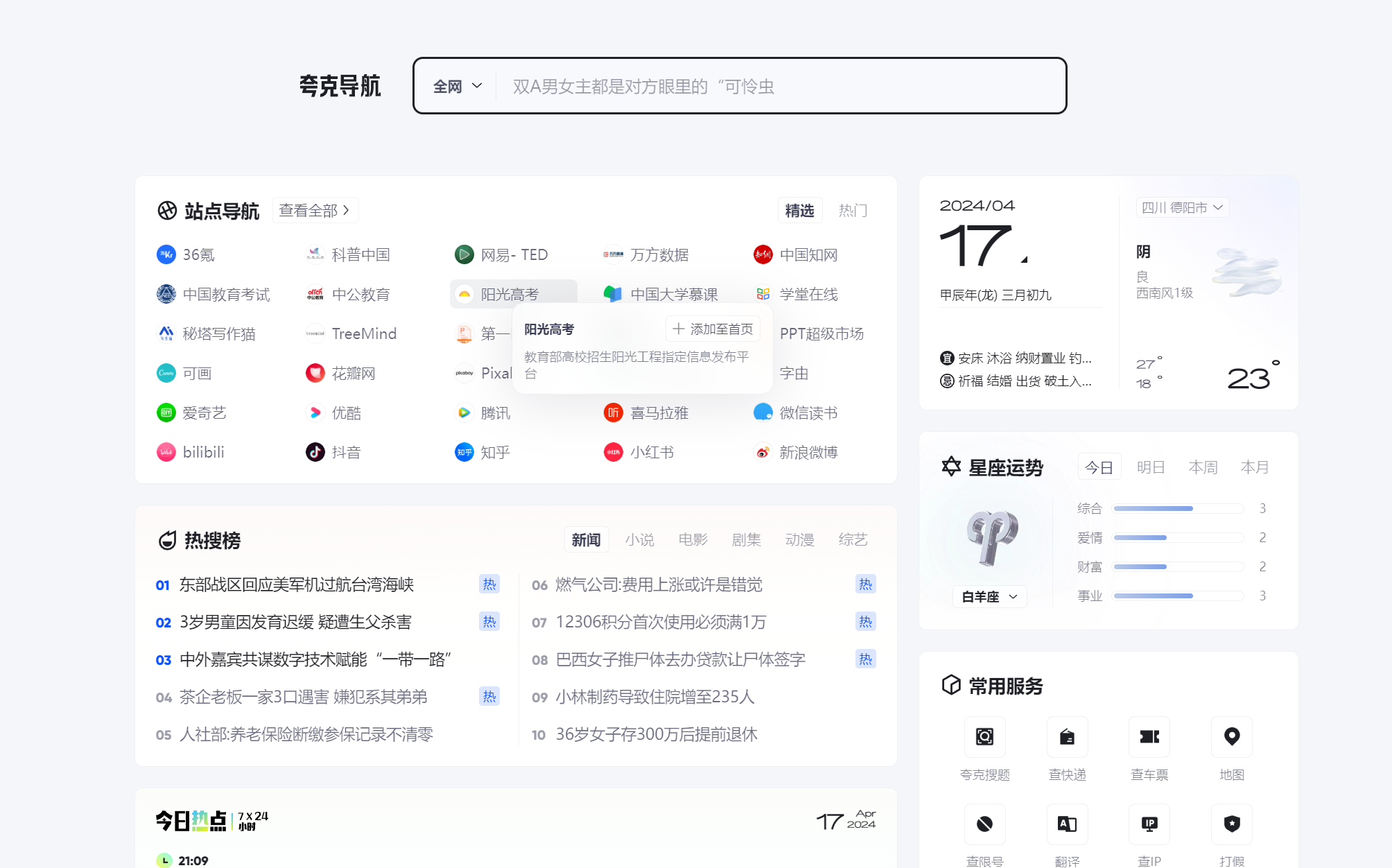 第二个比较好的功能,就是夸克自己的导航网站,在国内一众杀马特风格里面,确实是很清爽的,看看新闻,一键直接很多实用工具,还是挺好用的。