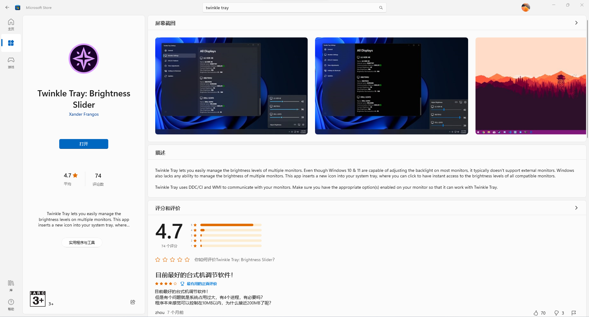 你可以下载安装,我试了一下,下载非常慢。也可以点击微软商店图标,会调取微软应用商店进行下载安装。也可以就去应用商店搜索twinkle tray,然后安装,非常方便。目前商店的评分是相当高的,可见这款应用还是有点东西的。