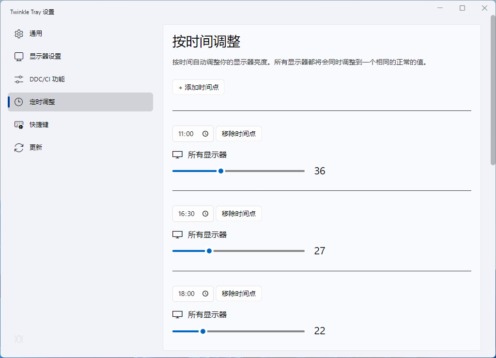 可以设置时间点,自动调整屏幕亮度。由于一般的显示器都没有环境光亮度检测器,那么就可以通过设定不同的时间点的屏幕亮度,来实现自动调节亮度的效果。如果使用显示器时间较长,这就非常好用。