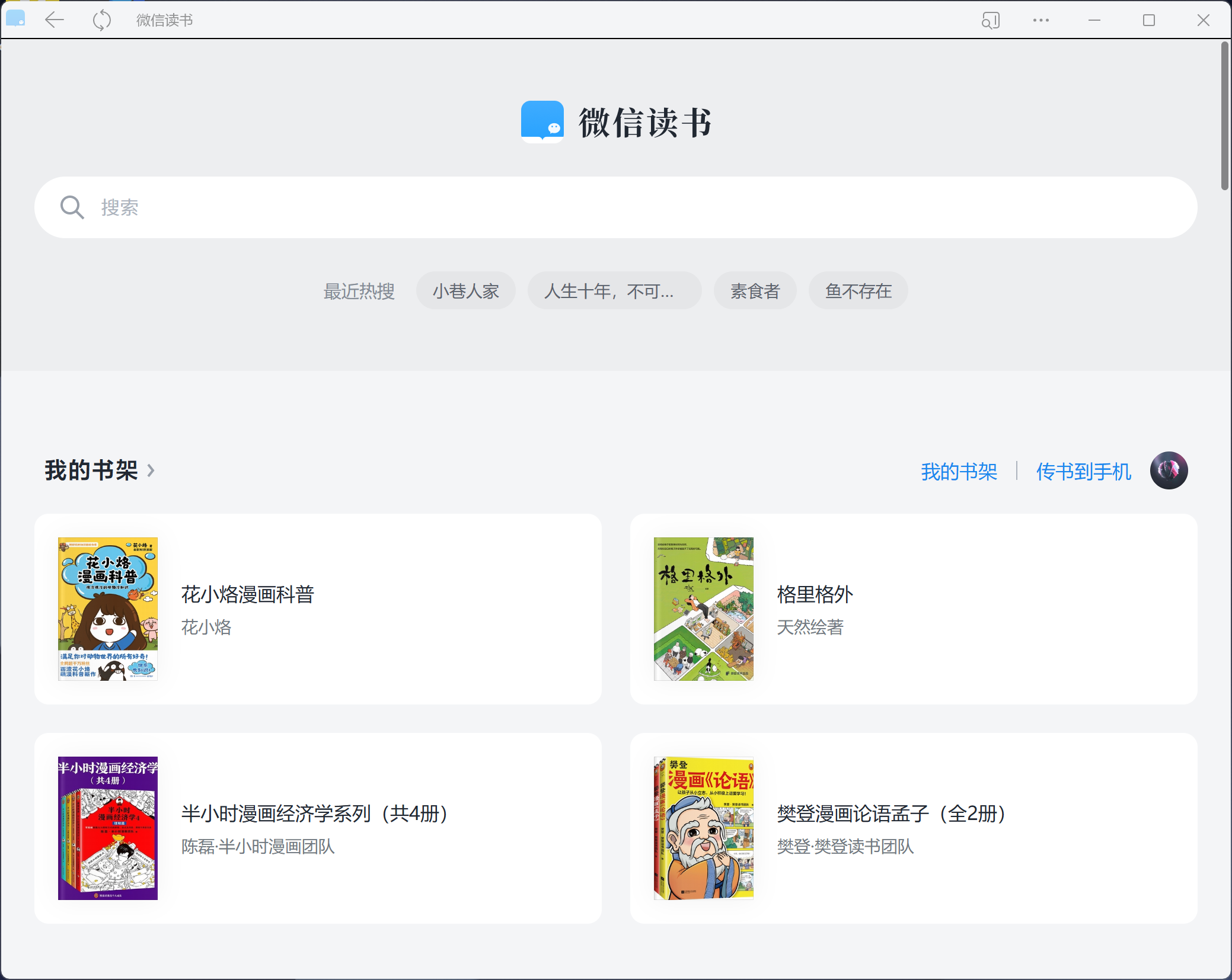 这个是微信电脑端直接打开的小程序,这个小程序在手机微信也可以直接打开,主打快速阅读,零负担(很多人对于安装app是非常反感的),那么就可以尝试在小程序里面使用微信读书。