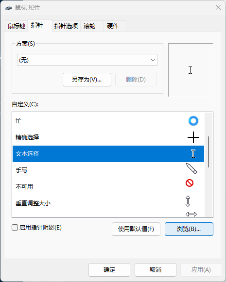 2.找到“指针”选项卡,找到“文本选择”,然后点击下面的“浏览”